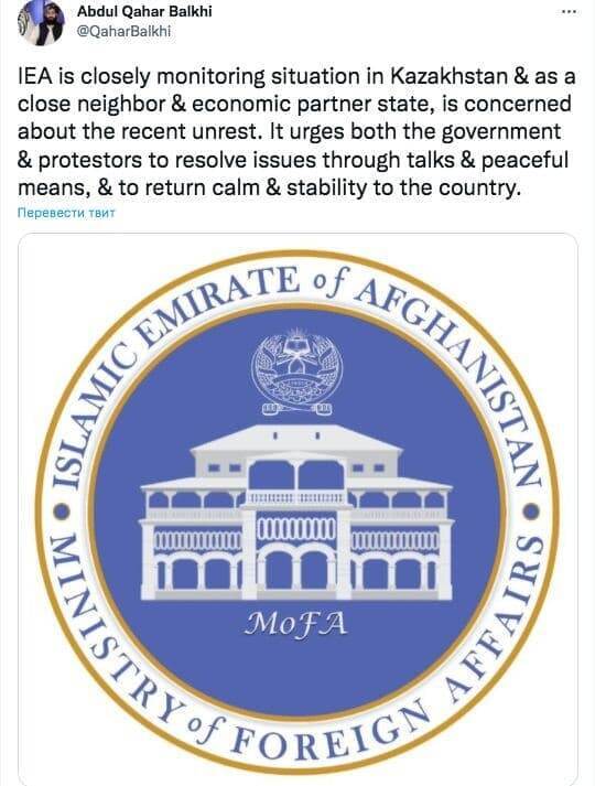 "Исламский эмират Афганистан" (используемое радикалами название государства) внимательно следит за текущей ситуацией в Казахстане и как сосед и торговый партнер обеспокоен недавними беспорядками в стране. В этой связи призываем правительство и протестующих решить существующие проблемы путем диалога и взаимопонимания", - подчеркивает пресс-секретарь афганского министерства иностранных дел Абдул Кахар Балхи.