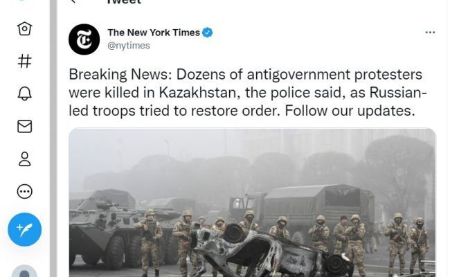 На официальной странице газеты в сети Twitter допущена, мягко говоря, довольно вольная трактовка трагических событий, происходящих в эти дни в Казахстане. В частности, издание разместило в социальной сети собственную же статью, посвященную вводу миротворцев ОДКБ на территорию Казахстана для стабилизации внутренней ситуации, сопроводив сообщение провокационным твитом:
