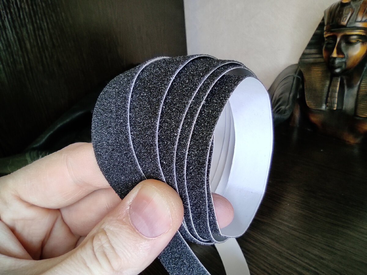 Вспомнилось, как летом клеил противоскользящую ленту на ступеньки в нашем двухэтажном доме. Чтобы никто не поскользнулся на лестнице. С виду она очень похожа на наждачную бумагу, с такой же крупной зернистостью, но сама лента заметно тоньше.