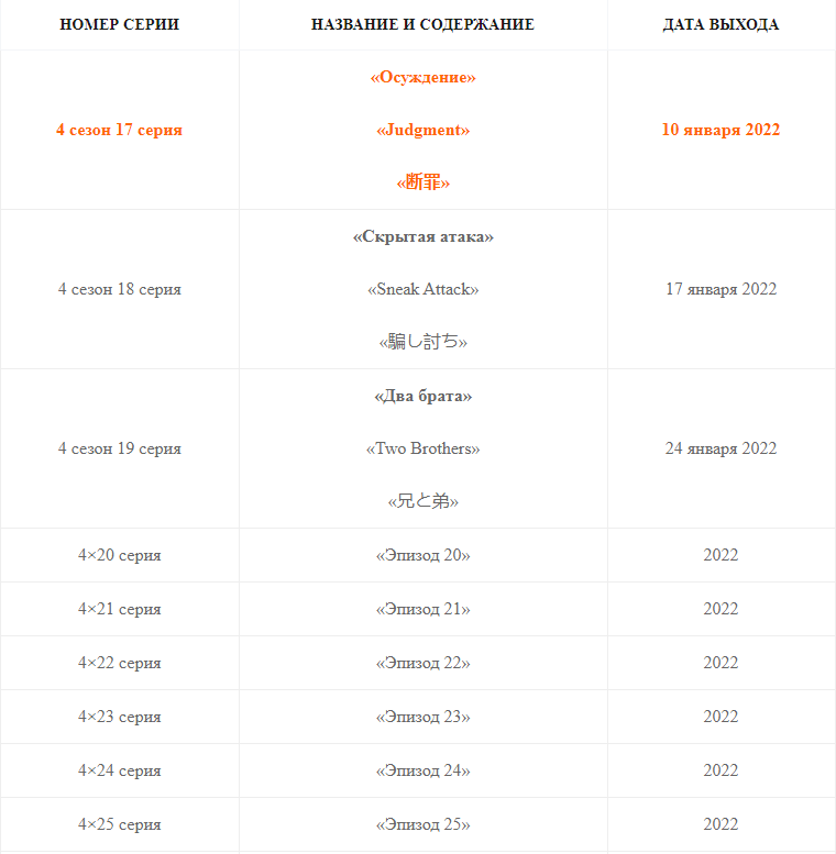 Японским телеканалом «NHK General TV» назначена дата выхода 17 серии 4 сезона аниме «Атака титанов» (английское название – «Attack on Titan», оригинальное – «進撃の巨人») на понедельник, 10 января 2022 года. Эпизод выйдет под названием «Осуждение». Начало трансляции в 00:05 по японскому времени.