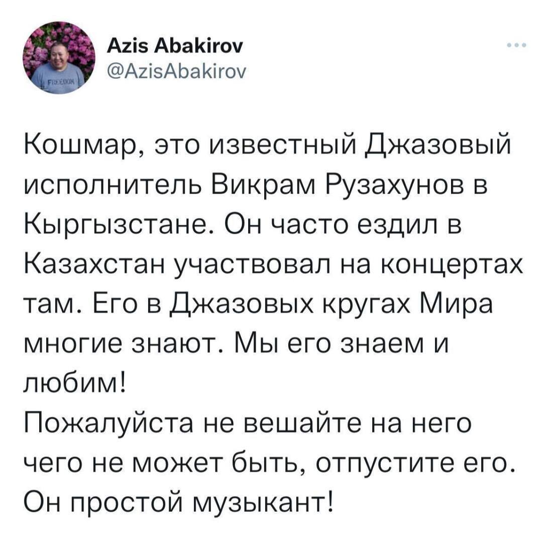 💁🏻‍♂️ Силовики Казахстана выдали за мародёра известного джазового музыканта из Кыргызстана Викрама Рузахунова, который якобы приехал в Казахстан на митинги, чтобы заработать $200.