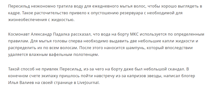 В этой новости прекрасно абсолютно все: и несгибаемая целостность, характерность актрисы, отстоявшей свою точку зрения о периодичности мытья волос, и гибкость экипажа станции, подавившего конфликт в самом зародыше, но теперь вынужденного более тщательно распределять питьевую воду, и фактическая реализация нашей космической программы, у истоков которой стояли Циолковский, Королев и Глушко.