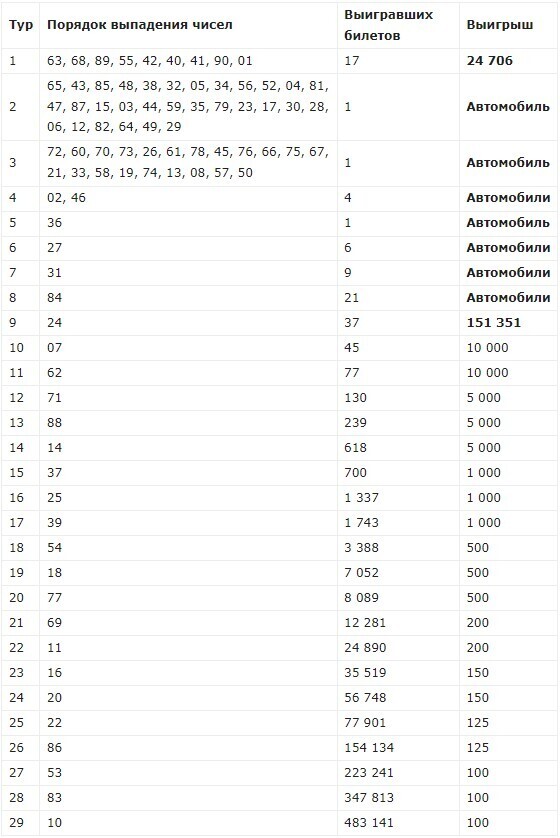 Для того чтобы легко определить сумму сегодняшнего выигрыша в Русском лото, мы как обычно публикуем тиражную таблицу. В ней числа расположены в той же последовательности, в которой ведущий доставал бочонки с ними из мешка.