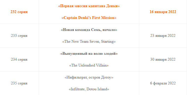 Японский телеканал «TV Tokyo» назначил дату выхода 232 серии «Боруто» на воскресенье, 16 января 2022 года. Эпизод получил название «Первая миссия капитана Денки». Зрителей ждут новые приключение главного героя и его близкого окружения.