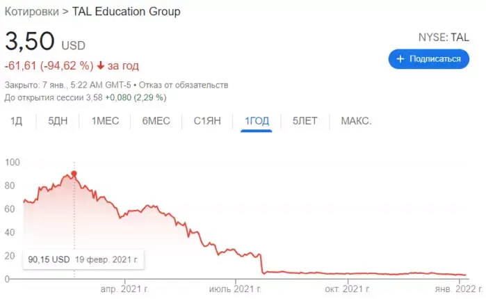 А потом в 2021 году китайские власти внезапно взяли курс на жесткое регулирование в образовательном секторе, де-факто запретив компаниям получать прибыль. Кому нужны компании без прибыли? Вот и остальные инвесторы на рынке так же решили, и акции модных «образовательных единорогов» вроде TAL бодро упали в двадцать раз (отголоски криков боли тинькоффских «пульсят», мне кажется, слышны до сих пор).