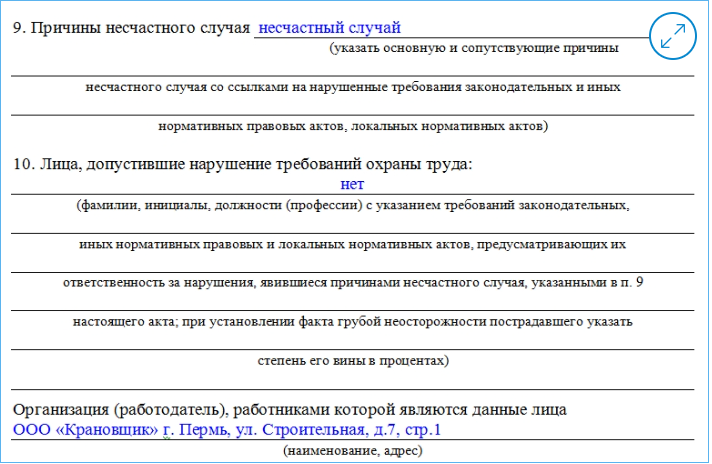 Пункт 9. Включает причину несчастного случая (коротко).