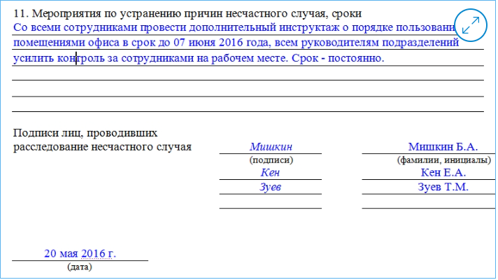 Завершающий этап акта – подписание документа всеми членами комиссии по расследованию. После этого акт о несчастном случае на производстве передается на подпись руководителю организации.