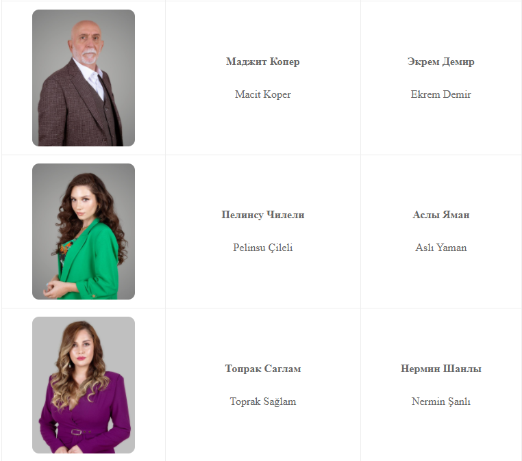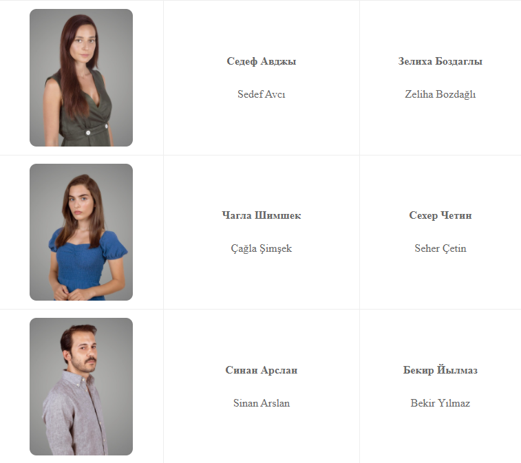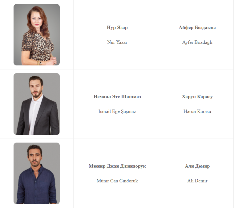 Актеры Севда Эргинджи, Перихан Саваш, Фикрет Кушкан, Нур Язар, Исмаил Эге Шашмаз, Мюнир Джан Джиндорук, Седеф Авджы, Чагла Шимшек, Синан Арслан, Маджит Копер, Пелинсу Чилели, Топрак Саглам