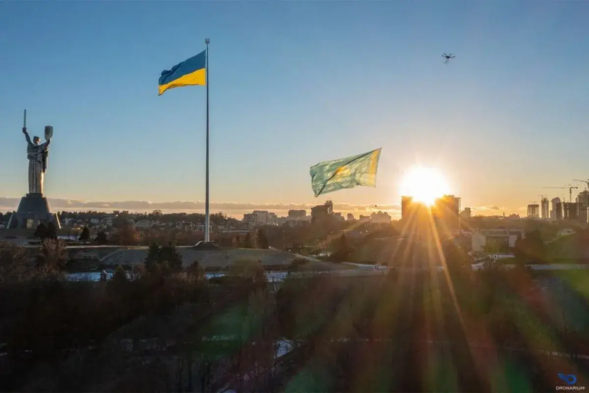 На опубликованных фотографиях видно, что флаг Казахстана был поднят при помощи дронов. Они пронесли его рядом с большим флагом Украины и монументом «Родина-Мать».