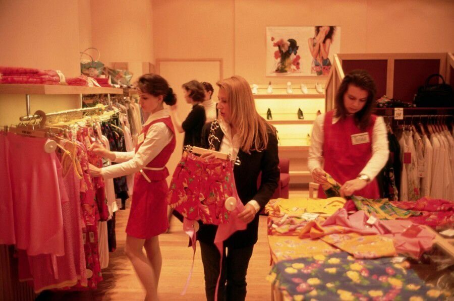 2. Девушка выбирает наряд в магазине. Обратите внимание. Прошло лет 5 с момента распада СССР, а богатые девушки уже переоделись в дорогую брендовую одежду.