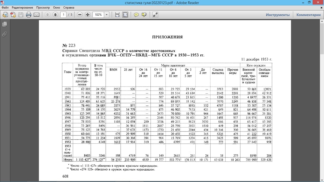 Ложь. Через ГУЛАГ прошло официальные цыфры 4,5 миллиона а не 20, при этом ктото дважды, было такое кто получал 5-10 лет потом отправляли еще на 25. Погибло и умерло гдето 700 тысяч, это и по приговору и от старости. Вы запросите данные, то что пишет автор трепался Хрущев, но когда запросил цыфры прикусил язык, ему подали вот эту статистику причем по годам там. Да за время перестройки Россия потеряла по данным переписи населения 70 миллионов за 10 лет, но это с мигрантами въехавшими и выехавшими, т.е. В обоих случаях есть погрешность которую нельзя убрать, но гелаг данные за 25 лет 4,5 миллиона, перестройка 70 миллионов за 10 лет. И не трепите мозги в Европе были контрационные лагеря Англия в ЮАР их вводила Гитлер в германии поляки евреев в гетто сажали, время было такое. Кстати высолку из приграничных территорий использовали также все а не только Сталин.