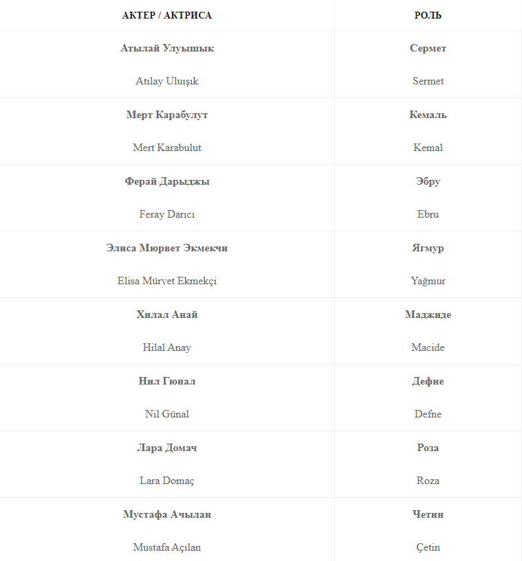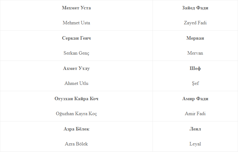 Актеры Чаглар Эртугрул, Дениз Байсал Юртджу, Месут Акуста, Эзги Эюбоглу, Тунджер Салман, Эзги Шенлер, Нихат Алтынкая, Сердар Егин, Ахмет Угур Сай, Явуз Бингёль, Тургут Тунчалп, Гюркан Уйгун, Хакан Бояв