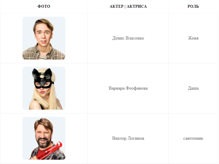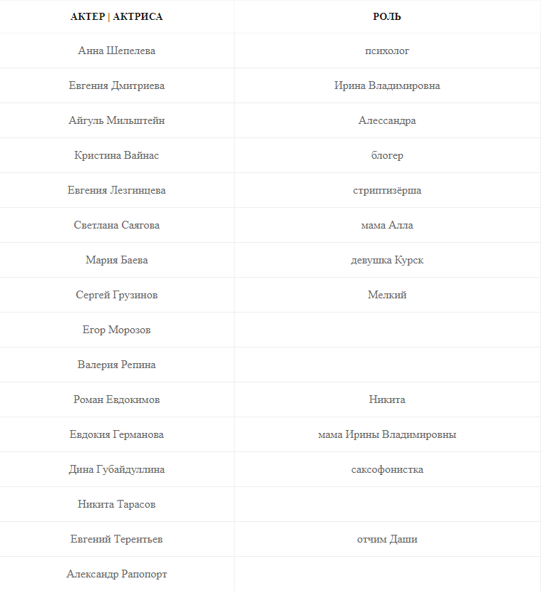 Актеры Денис Власенко, Варвара Феофанова, Виктор Логинов, Евгения Дмитриева, Анна Шепелева, Кристина Вайнас, Евгения Лезгинцева, Айгуль Мильштейн, Светлана Саягова, Роман Евдокимов, Дина Губайдуллина, Мария Баева, Сергей Грузинов, Никита Тарасов, Валерия Репина, Егор Морозов, Александр Рапопорт и др.