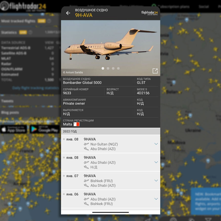 Свои маршруты у бизнесджета Bombardier Global 5000 с регистрационным номером 9H-AVA. В соцсетях распространились слухи, что им пользовался Тимур Кулибаев — зять Нурсултана Назарбаева. Согласно авиабазам, этот борт принадлежит мальтийской авиакомпании Maleth Aero, которая занимается частными авиаперевозками.