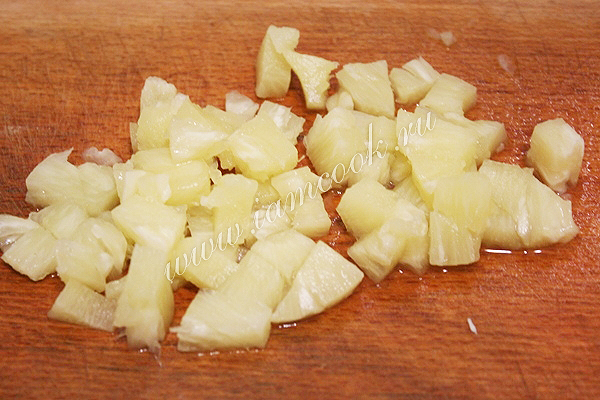 С ананасов слейте сироп. Нарежьте небольшими кусочками.