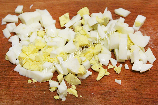 Яйца отварите вкрутую. Остудите под холодной водой. Мелко порубить куриные яйца