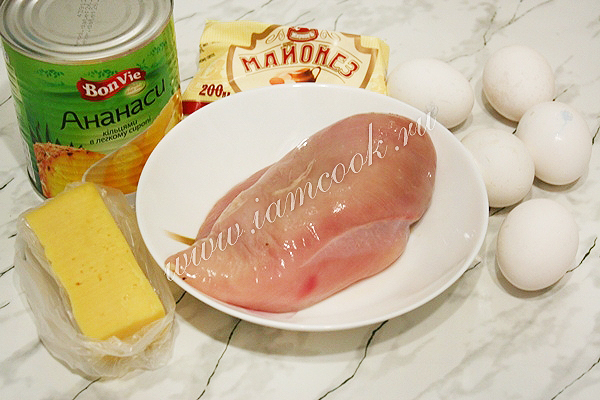 Для салата с ананасами и куриной грудкой нам достаточно простых ингредиентов: понадобится куриное филе, яйца, ананасы и сыр.