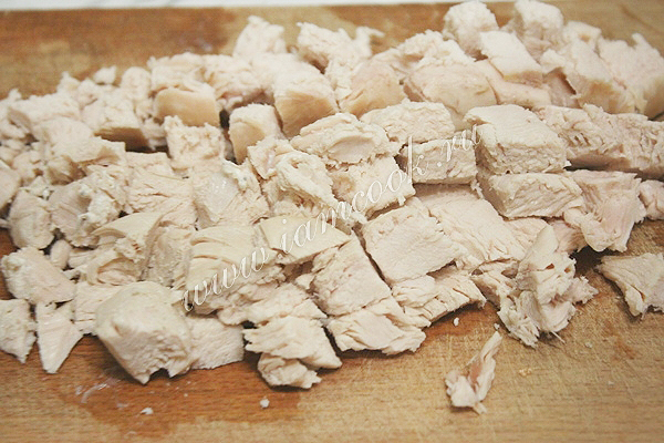 Куриную грудку отварите до готовности. Достаньте из бульона и оставьте остывать. Остывшую куриную грудку нарежьте кубиками.
