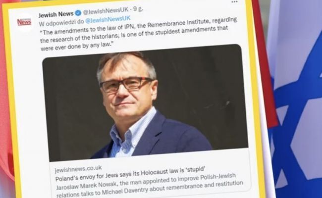 В интервью Jewish News Ярослав Новак раскритиковал поправки в закон об Институте нацпамяти Польши, принятые ещё в 2018 году. Согласно поправкам, в стране введена уголовная ответственность каждому, «кто, публично и вопреки фактам приписывает польскому народу или государству участие или соучастие в нацистских преступлениях, совершенных Третьим рейхом». Именно эта часть документа вызвала возмущение в Израиле, поскольку, как поясняла 4 года назад посол Изралия в Польше Анна Азари, «он позволяет преследовать выживших жертв Холокоста, которые рассказывают свою историю».