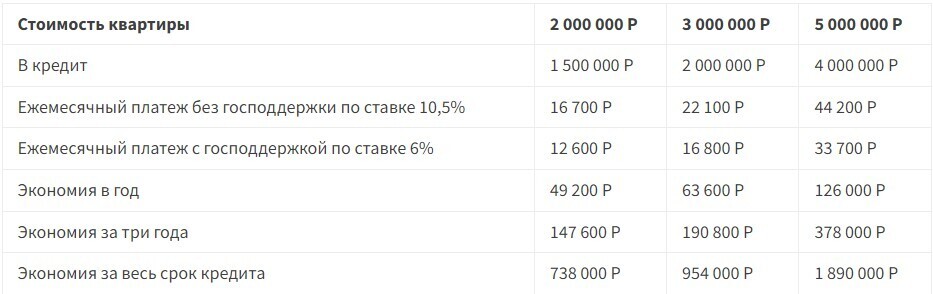 По ипотеке с господдержкой семья будет платить банку 6% все 15 лет. То есть ежемесячный платеж составит 12 600 Р. В год благодаря господдержке семья будет экономить почти 50 тысяч, а за 15 лет сэкономит 738 тысяч рублей. А раньше за три года сэкономила бы только 150 тысяч.