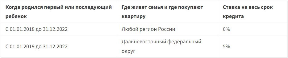 - Для жителей Дальнего Востока особые условия: при рождении хотя бы второго ребенка с 2019 года — льготная ставка 5%. Можно покупать вторичное жилье, но только в селе.