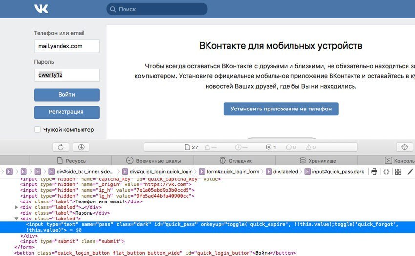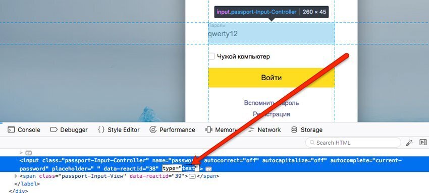 появившейся панели инспектора находим строку input type= password (только с кавчками), нажатием на слово password меняем его на text.