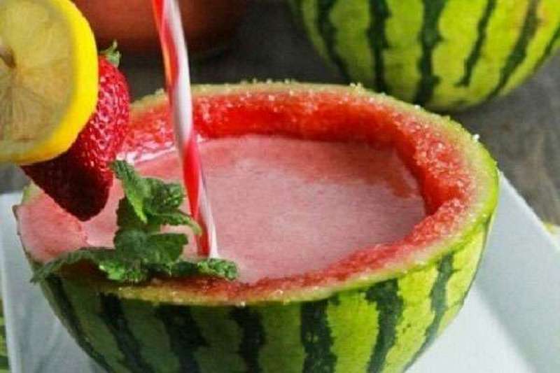 Начнём с того, что все составляющие надо охладить. Затем, нарезаем фрукты, засыпаем сахаром и заливаем вином, коньяком и на два часа оставляем. Аккуратно выбираем мякоть арбуза, предварительно удалив верхнюю часть. Внутренность освобождаем от косточек, нарезаем кубиками и вместе с залитыми фруктами закладываем в арбуз. Далее, вливаем шампанское с ликёром и закрываем срезанной верхушкой. Всё, наш коктейль готов и надо только дать немного ему настояться.