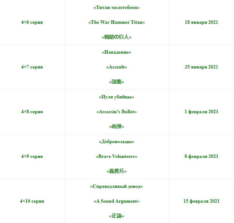10 января 2022 года на японском телеканале «NHK General TV» состоялась премьера второй части 4 сезона аниме «Атака титанов», основанного на одноименной манге Хадзимэ Исаямы. Известно, что четвертый сезон саги станет финальным. Первая часть четвертого сезона выходила с 7 декабря 2020 по 29 марта 2021 года. Каждая из частей состоит из 16-ти серий. Эпизоды выходят по понедельникам по одному в неделю. В русской озвучке и субтитрах аниме выходит в онлайн-кинотеатрах «Wakanim» и «Crunchyroll».