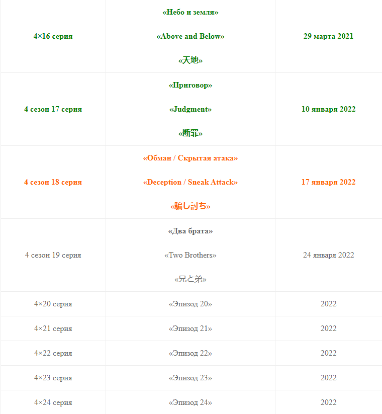 Японским телеканалом «NHK General TV» объявлена дата выхода 18 серии 4 сезона аниме «Атака титанов» (английское название – «Attack on Titan», оригинальное – «進撃の巨人») на понедельник, 17 января 2022 года. Эпизод выйдет под названием «Обман / Скрытая атака». Начало трансляции в 00:05 по японскому времени.