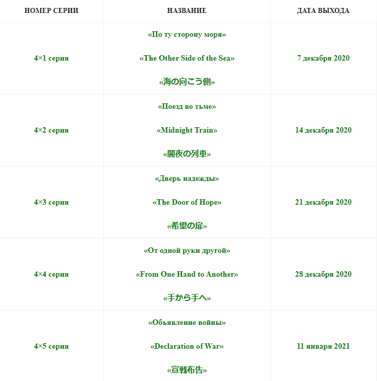 Премьера 4 сезона 7 декабря 2020 (Часть 1), 10 января 2022 (Часть 2)