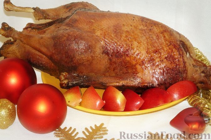 Кисло-сладкая начинка в данном блюде прекрасно оттеняет немного сладковатый вкус гусятины. А самое замечательное в рецепте то, что готовится такой Рождественский гусь из самых простых и доступных ингредиентов.
