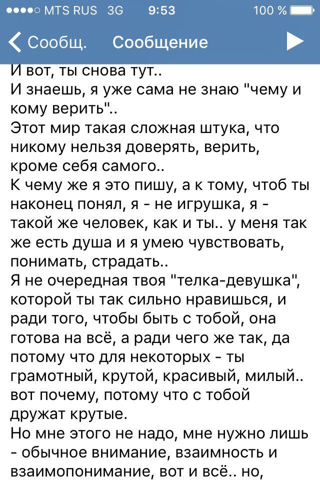 Как же это все мило и очаровательно. А в конце выстреливает обещание покончить с собой и фраза "я не могу без тебя жить, когда тебя нет я не могу дышать, ничего не могу". Чистый инвалид, а не телка.