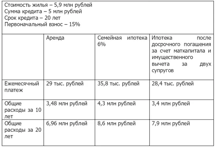 Допустим, в Екатеринбурге аренда двухкомнатной квартиры обойдётся примерно в 29 тыс. рублей в месяц. Средняя стоимость такого жилья на первичном рынке составляет около 5,9 млн рублей. При оформлении «Семейной ипотеки» по ставке 6% в качестве первоначального взноса придётся заплатить 15% от этой суммы или 885 тыс. рублей. Если срок кредита составит 20 лет, то ежемесячный платёж будет равен примерно 35,8 тыс. рублей. Однако эта сумма может быть уменьшена до сопоставимых с арендой значений при использовании досрочного погашения.