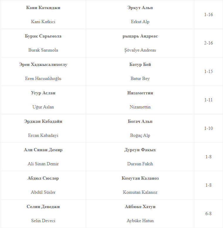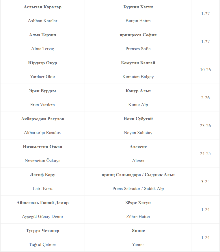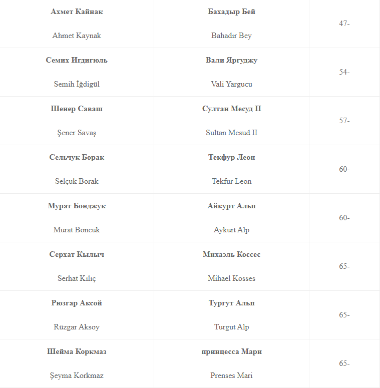 Бурак Озчивит, Дидем Балчын, Йылдыз Чагры Атиксой, Серхат Кылыч, Эркан Авджы, Седа Йылдыз, Йылдырай Шахинлер, Озге Тёрер, Эмре Басалак, Рюзгар Аксой, Бурак Челик, Чагры Шенсой, Йигит Учан, Ахмет Енильмез, Эмин Гюрсой, Бусе Арслан, Эмель Деде, Шейма Коркмаз, Ачелья Озджан, Фатих Айхан, Омер Аган, Ахмет Кайнак, Сердай Каяокай, Огузхан Карби, Серхат Парыл, Мелис Гюрхан, Джан Барту Аслан, Бурак Альп Енильмез, Гизем Кала, Реджеп Чавдар, Рывдан Улудашдемир, Сердар Акюлкер