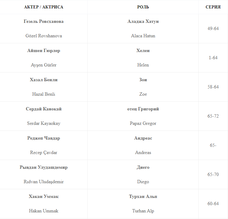 Коварную Софью сыграла звезда сериалов «Дело чести» («Seref Meselesi») и «Великолепный век. Империя Кёсем» («Muhtesem Yüzyil: Kösem») Алма Терзич.