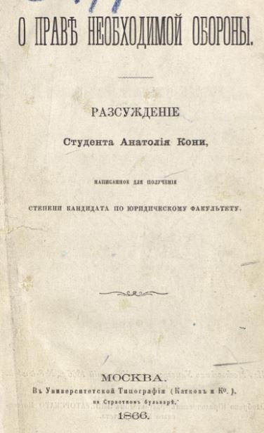 Заслуженный юрист России Анатолий Федорович Кони закончил юридический факультет Московского Университета и в своей первой печатной работе "О праве необходимой обороны" 1866 г. вызвал резонанс среди общественности.