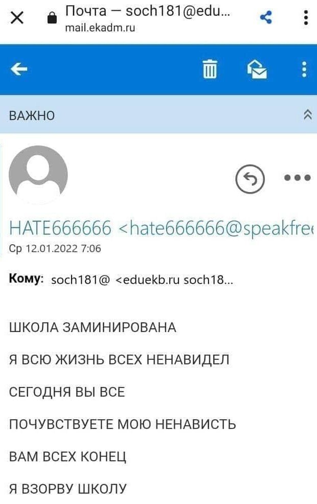 Как выяснилось позже, это сообщение было далеко не первым. Они приходят с 2017 года. И уже тогда их обсуждали на заседании антитеррористической комиссии. Тогда поговорили о «настройке спам-фильтров»... и всё. Потому что здесь очень тонкая грань: если хоть одно сообщение окажется правдой, но улетит в спам, будет беда. Поэтому детей до сих пор эвакуируют, а силовики бегают по школам с собаками. Как говорят в ФСБ: «Как правило, ложные угрозы направляют с компьютера с изменённым IP-адресом. При этом, по каждому сообщению о минировании следственно-оперативными группами ФСБ и МВД проводится полный цикл проверочных мероприятий». После сообщений о массовом минировании родители учеников требуют наказания для того, кто разослал предупреждение. «Неужели не могут выяснить по ip-адресам этих лжеминеров? Если это просто развлекающиеся неадекваты-подростки, вряд ли они соблюдают все предосторожности и сильно шифруются». Так откуда приходит все эти «сообщения о минировании»? Сами школьники что ли этим занимаются? Как сказал мэр Екатеринбурга: «Это вмешательство извне, мы такое уже не раз проходили за последние два-три года. К сожалению, есть деструктивные силы из ближнего зарубежья, которые раскачивают ситуацию» .