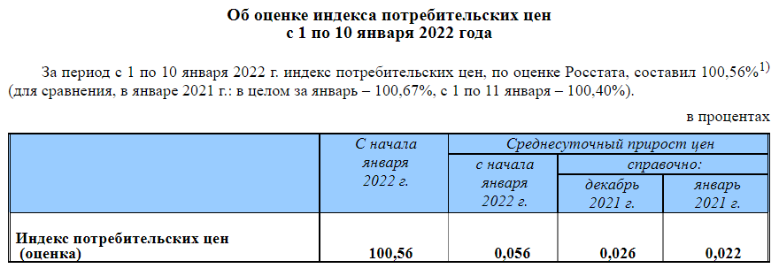 Среднесуточный рост цен за десять дней января 2022 года, по данным Росстата, составил 0,056%, тогда как за аналогичный период января 2021 года - лишь 0,036%.