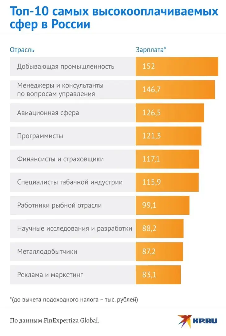 Примечательно, что в число самых дорогих специалистов попали не только офисные сотрудники и те, кто связан с добычей полезных ископаемых. К примеру, на седьмом месте оказались рыбаки и другие представители рыбной отрасли. Высокие зарплаты в отрасли связаны с нехваткой кадров, готовых надолго уходить в море. Кроме того, рыбопромысловые предприятия зачастую находятся в районах Крайнего Севера.