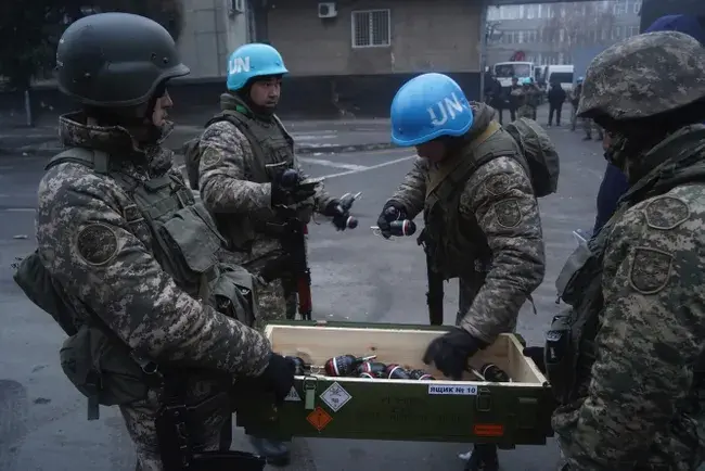 В Twitter постпред Казахстана при ООН Магжан Ильясов написал, что миротворческое подразделение КАЗБАТ «приведено в повышенную боевую готовность для оказания помощи и защиты объектов стратегической инфраструктуры» в Алматы от «террористов и экстремистов». «За исключением касок, которые носили в составе служебной экипировки местных миротворцев во время высокой угрозы, никакой экипировки с пометкой «ООН» не применялось», — подчеркнул он.
