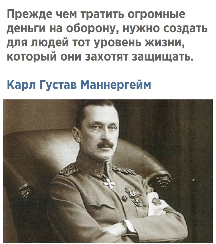 В начале 30-х он снова понадобился. Вернувшись в Финляндию, был назначен в 1933 году на пост Председателя Совета обороны с присвоением звания почетного маршала Финляндии. Его позиция по отношению к русским не изменилась. Он прекрасно осознавал, что реально сильный сосед Финляндии не потерпит такой близости границы к Ленинграду и готов был ее отодвинуть на условиях территориальных уступок Советского Союза в Карелии. При этом ему, как профессиональному военному, было абсолютно ясно, что если не договориться, то война может начаться в любой момент, так как формальный повод всегда найдется, и он это прекрасно понимал. Так и случилось, в итоге началась известная «зимняя» война. После этой войны авторитет Маннергейма в обществе и правительстве стал настолько высок, что любые важные государственные решения принимались только при его участии. Вот так он и стал действительно отцом нации.