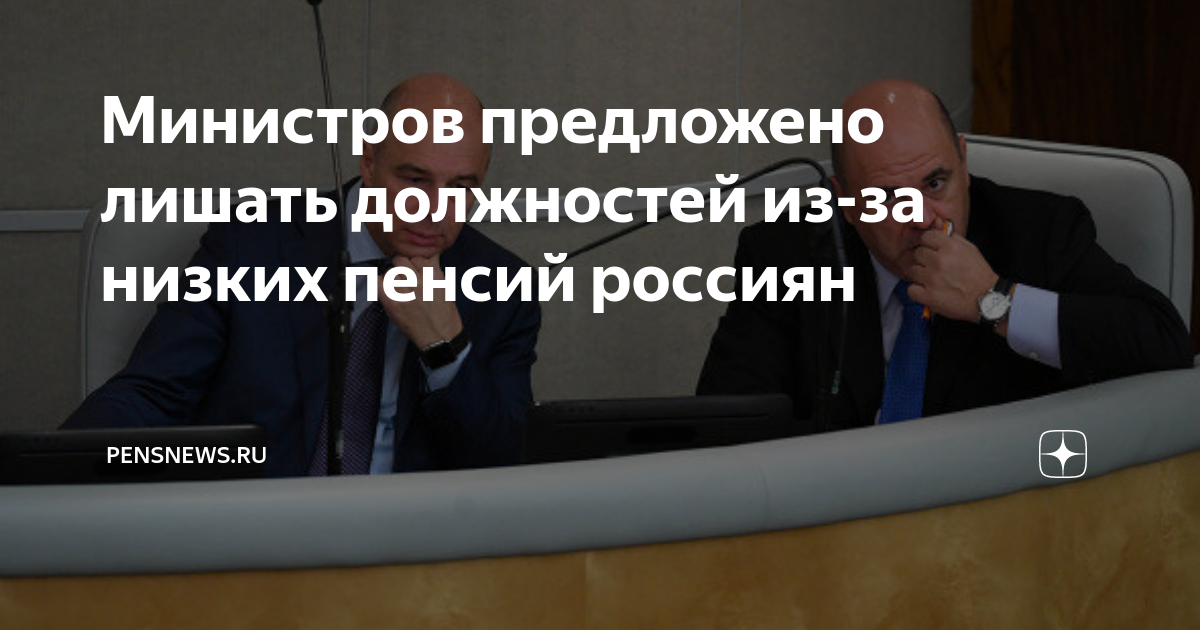 Источник: https://zen.yandex.ru/media/pensnews/ministrov-predlojeno-lishat-doljnostei-izza-nizkih-pensii-rossiian-61deb8eea577393165bf5632