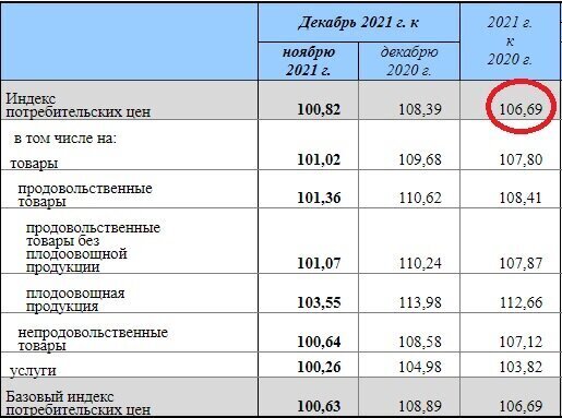 Индекс потребительских цен в 2021 г. в сравнении с 2020 годом составил 106,69%. Если сравнивать декабрь 2020 года и декабрь 2021 года, то ИПЦ равен - 108,39%.