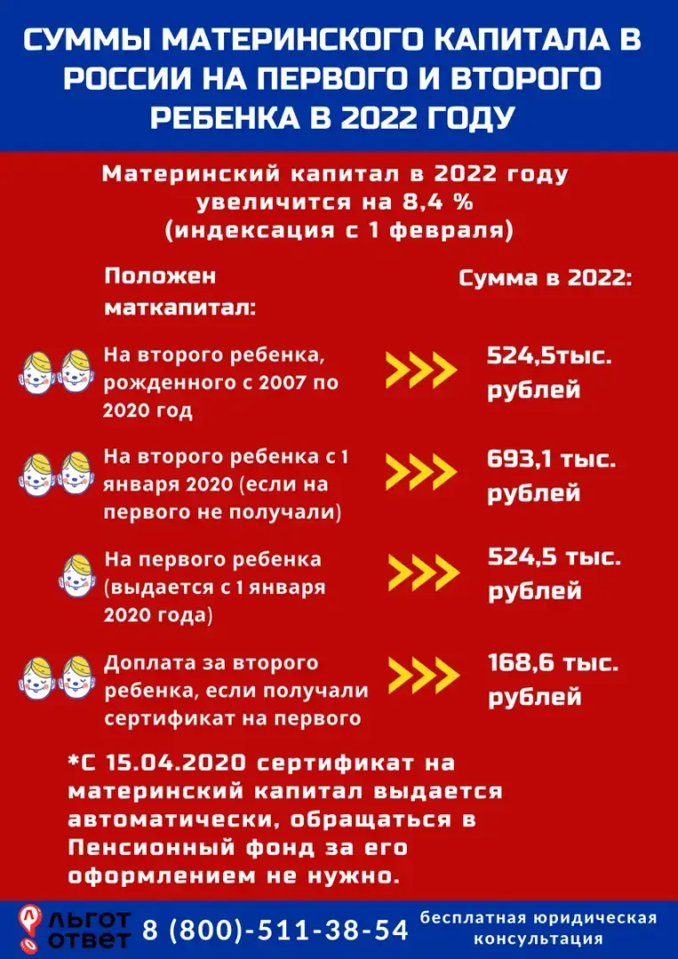 Размер маткапитала в 2022 году на первого и второго ребенка