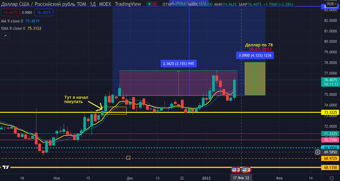 Конечно большую часть я продам только, при условии 100 рублей за доллар, но часть продам в "желтой зоне" ориентир 26.01.2022 по курсу 78 рублей за доллар.