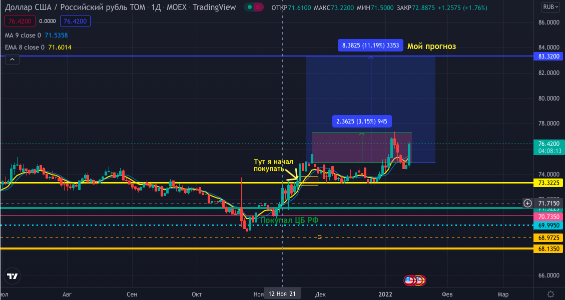 Я покупал по средней цене 73, почти сразу после выхода новостей о том, что Минфин будет закупать объемно валюту, зеленой линией отмечено по какой цене он/ (оно) покупал/ (о). (Общим синим квадратом) отмечен мой прогноз по курсу доллара на основании прошедших 6 лет. 30% из моего прогнозируемого события были выполнены, до 26 января ещё время есть и все возможно. После ожидается коррекция и тогда есть смысл присмотреться к покупке.