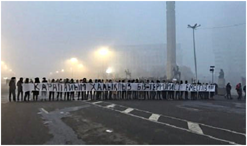 Мы спрашиваем, нужна ли помощь, все ли целы, в это время митингующие выносят из-за стеллы длинную растяжку на казахском «Мы простой народ, мы не террористы». Сначала несмело и вразнобой скандируют этот лозунг, в какой-то момент кто-то из лидеров начинает выкрикивать: