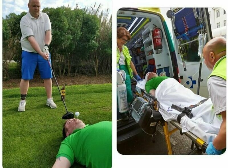 . "Приветики. На фото я лежу с подставкой для мяча во рту. Можешь сделать так, будто мой друг уже ударил по мячу?"