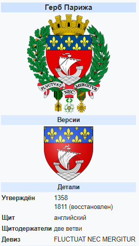 С 1853 года на гербе Парижа размещён его девиз — «Fluctuat nec mergitur»[3], однако это латинское выражение возникло намного раньше. В переводе оно означает «Его качает, но он не тонет» или «Он качается, но воды не губят его".