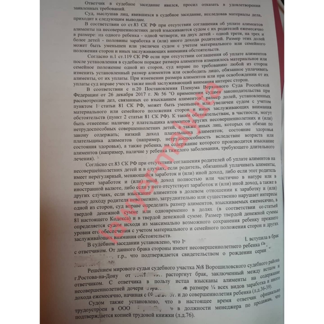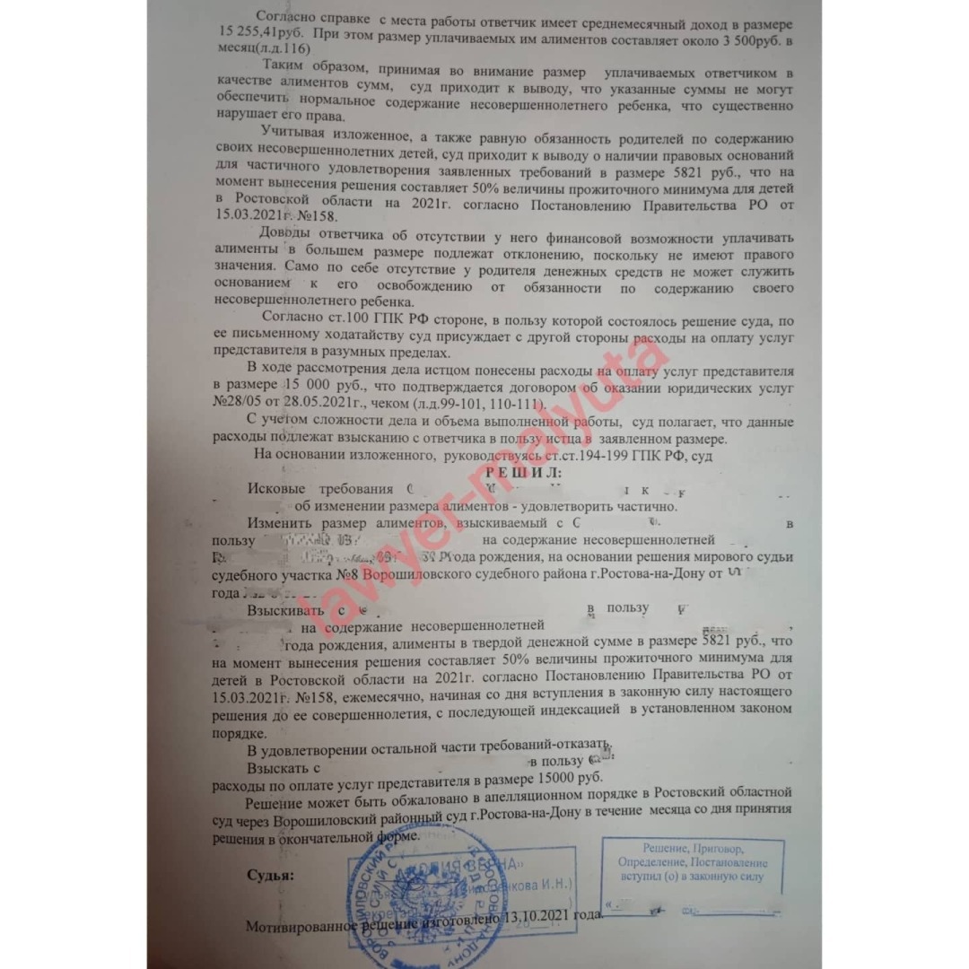 Изначально я попробовала в суде заявить требования о взыскании алиментов в долях и в твердой денежной сумме. Но одновременно-это редкая судебная практика и имеет свои особенности, поэтому в итоге решено было взыскивать просто в твердой сумме в размере прожиточного минимума на детей. Суд присудил половину прожиточного минимума с последующей индексацией - это нормальная практика, суды часто снижают размер, особенно если истцом не представлены низкие доходы и/или большие расходы на ребенка, превышающие доходы и другие условия. Но зато в моем деле суд взыскал в пользу клиента всю сумму расходов на оплату услуг представителя, что бывает крайне редко.